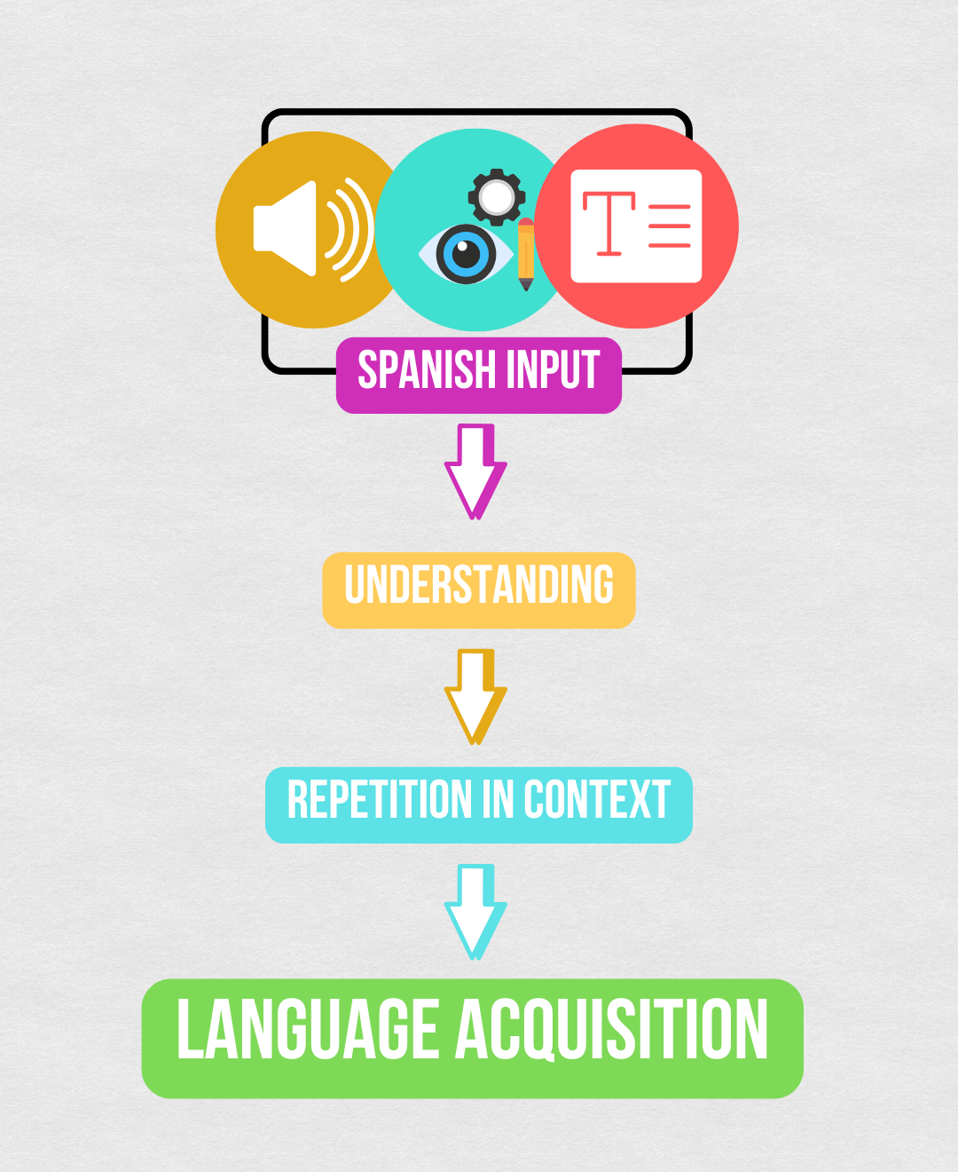 - Comprehensible input means giving students Spanish they can actually understand through text, visuals, videos, music, gestures, and context.